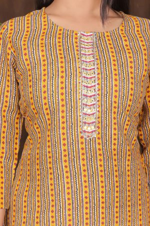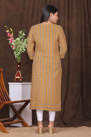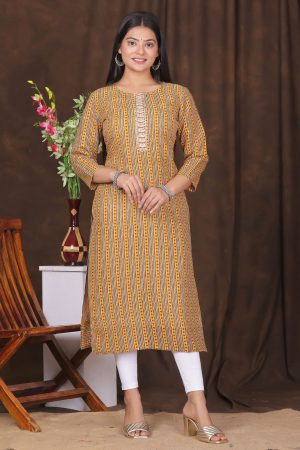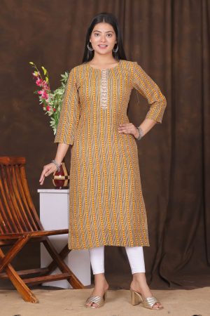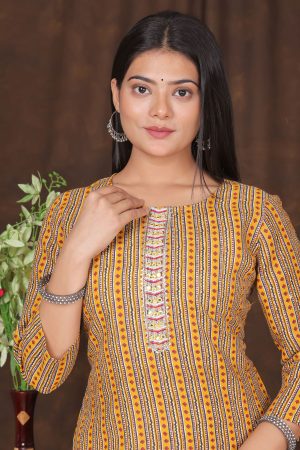 The Kairab Women’s Embroidered Striped Printed Straight Kurta is a stylish and comfortable choice for any wardrobe. Crafted from high-quality fabric, this mustard-colored kurta showcases a unique combination of embroidered patterns and striped prints, adding a touch of elegance to your look. The straight-fit design ensures a flattering silhouette, making it suitable for everyday wear or special occasions. Pair it with leggings, palazzos, or trousers for a versatile and effortless outfit