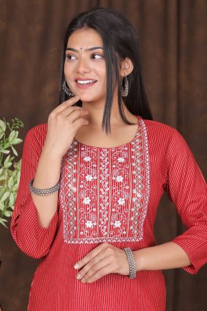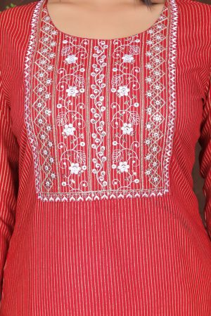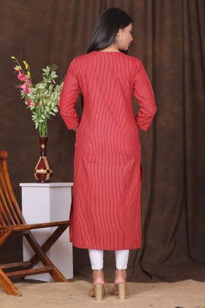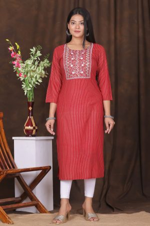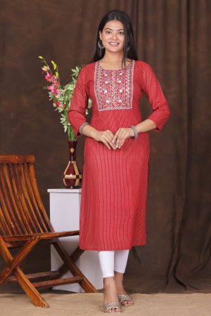 The Kairab Women’s Embroidered Striped Printed Straight Kurta is a timeless blend of tradition and modern style. Crafted from high-quality fabric, this maroon kurta features a straight-cut design that ensures a flattering fit. The delicate embroidery on the neckline and yoke enhances its elegance, while the subtle striped print adds a contemporary touch. Designed for comfort and versatility, this kurta is ideal for casual outings, work, or festive gatherings. Pair it with leggings, palazzos, or trousers for a complete ethnic look.