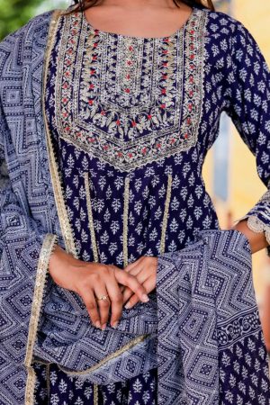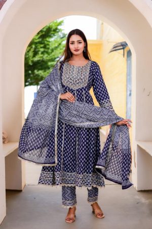Enhance your ethnic wardrobe with the Kairab women’s printed and embroidered Anarkali kurta set. Designed in a stunning blue hue, this set includes a gracefully flared Anarkali kurta adorned with beautiful prints and intricate embroidery, adding a touch of elegance. The set is paired with comfortable matching pants and a coordinating dupatta, making it perfect for festive occasions, celebrations, or casual gatherings. Crafted from high-quality fabric, this outfit ensures both style and comfort, keeping you effortlessly chic throughout the day.