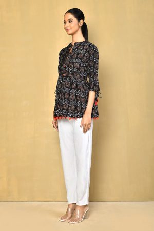 Enhance your wardrobe with the Kairab Women’s Printed Top, a perfect blend of tradition and modern style. Designed for comfort and elegance, this top features a striking black base adorned with intricate prints that add a touch of sophistication. The delicate pom-pom detailing along the hem and sleeves adds a playful charm, making it an ideal choice for both casual and semi-formal occasions. Crafted from high-quality, breathable fabric, this top ensures all-day comfort while keeping you stylish. Pair it with jeans, skirts, or ethnic wear to create a variety of fashionable looks.